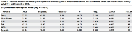 數據:Table 3顯示DistLM模型中,溫度貢獻16.3%通量變異,葉綠素a/褐藻素比11.8%。Table 4和Fig 3的dbRDA圖揭示了溫度和DO是主要驅動因子。