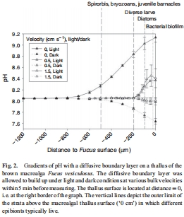 數據:圖2顯示,在Fucus藻表面,靜止水中光暗切換導致pH波動達1.5單位(距表面200μm內),流速增至0.5 cm/s時波動減至0.5單位。