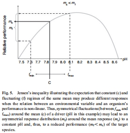 數據:圖5用Jensen不等式說明,對稱pH波動(如日循環)因生物響應非線性導致非對稱性能量輸出(平均響應低于恒定條件)。