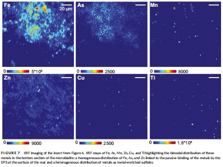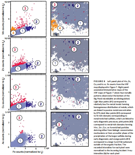 數據描述:圖5顯示頂部微生物巖中金屬(Fe、Cu、Zn、As)在有機層內均勻分布;圖6和圖7揭示底部金屬呈異質性熱點,富集在硫化物相中;圖8通過計數散點圖區分三種模式:均勻矩陣結合(趨勢#1)、Fe硫化物富集(趨勢#2)和單金屬球狀體(趨勢#3)。
