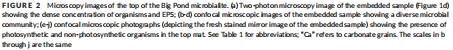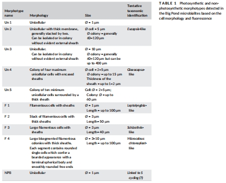 數據描述:圖2-4的CLSM和TPEM圖像顯示微生物多樣性(如藍藻鞘結構)和EPS空間變化;表1總結9種微生物形態類型(如Un1-Un5、F1-F4)。