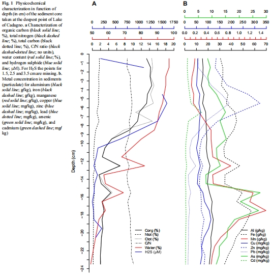 數據:Fig. 1a 顯示TOC和TN隨深度增加而下降(TOC從15%降至2%),C/N比從8.5升至10,表明有機質降解和營養可用性降低;H2S濃度在6厘米處峰值(1600 μM),反映硫還原活性。Fig. 1b 顯示金屬(如Zn、Pb、Cd)在3.5-8.5厘米層積累峰值(Zn 322 mg/kg),對應歷史工業污染時期。