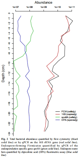 數據:Fig. 2 顯示總細菌和EFF豐度隨深度指數下降(總細菌從5e10降至1.5e9細胞/g),而內生孢子線性增加(從1.8e7升至1e8孢子/g),與有機碳減少顯著負相關。