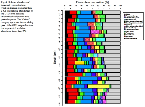 數據:Fig. 3 顯示群落隨深度演變:Proteobacteria在淺層(0.5-3.5厘米)主導,Firmicutes在深層(>16.5厘米)占優(相對豐度達50%)。Fig. 4 揭示Firmicutes亞群中,Clostridium sp.與金屬濃度正相關,而其他類群(如Paenibacillus)與有機碳負相關。