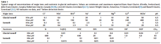 數(shù)據(jù)范圍:表1匯總了全球典型冰川融水中主要離子(如Ca2? 20–50 μM)、營(yíng)養(yǎng)鹽(NO?? 0.1–10 μM)及甲烷(2.7–83 μM)的濃度范圍。