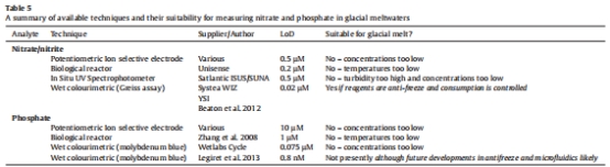 研究意義:為傳感器檢測(cè)限設(shè)定提供基準(zhǔn)(參考表2),例如硝酸鹽傳感器需達(dá)到0.05 μM檢測(cè)限才能有效監(jiān)測(cè)冰川融水。