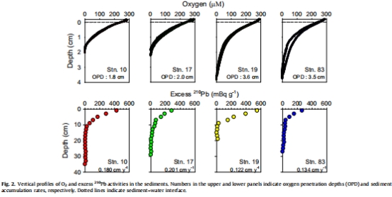 數(shù)據(jù)特征:圖2顯示冰間湖站點(Stn.10、17)的OPD較淺(1.8–2.0 cm),而冰架和海冰區(qū)站點(Stn.19、83)OPD更深(3.5–3.6 cm)。沉積物積累率在冰間湖更高(0.180–0.201 cm yr?1)。