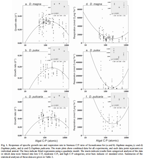 論文摘要指出,食物碳磷比(C:P)不僅在高值時(如>250-300)會抑制消費者生長,低值時(如<120)也可能產生負面影響,這種現象被稱為“化學計量刀鋒效應”。本研究以三種水蚤(Daphnia magna、D. pulicaria 和 D. pulex)為模型,喂養C:P比范圍廣泛(原子比<50至>1500)的綠藻Scenedesmus acutus,測量其生長率、攝食率和呼吸率。結果發現,所有物種在食物C:P過高或過低時生長均減慢,呼吸率增加,表明代謝成本上升;攝食率在低C:P食物上反而升高。這些結果提示,食物C:P失衡通過增加能量消耗影響水蚤性能,低C:P的負面效應在富磷湖泊中可能起重要作用,需納入浮游生物營養相互作用模型。
