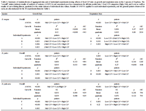 數據:圖1顯示三種水蚤的生長率均呈單峰響應,在中等C:P比(約120-230)時最高,在低C:P(<120)和高C:P(>230)時顯著降低(例如D. magna在C:P=250時生長率峰值約0.3 d?1,在C=P=60和1000時降至0.1 d?1)。表2統計驗證各組差異顯著(p<0.001)。