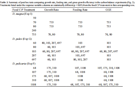 數據:圖2顯示攝食率呈U形響應(如D. pulex在低C=P=60和高C=P=1000時攝食率升高),而總生長效率(GGE)在中等C:P時最高(約0.5-0.6),在失衡時下降至0.1-0.3。表3 post-hoc檢驗證實處理間差異顯著(p<0.05)。