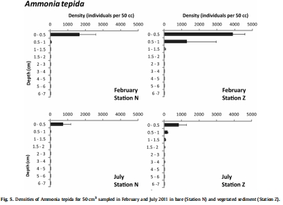 數據:Fig.5和Fig.6顯示鈣質物種(A. tepida和H. germanica)主要集中在沉積物表層(0-0.5 cm),而有植被站點分布略深;Fig.7顯示E. scabra在深層(至7 cm)仍存活。