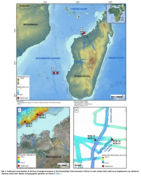站點選擇:在莫桑比克海峽選取四個對比站點(Fig. 1),包括兩個上坡站點(Betsiboka和Mahavavy斜坡,530-780米深度)和兩個深海峽谷站點(Tsiribihina和Zambezi峽谷,>3000米深度),覆蓋不同營養水平和氧合條件。