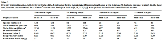 數據:Table 3顯示有孔蟲密度最高在Mahavavy斜坡站點(MTB-7B核心,3740個體/100 cm2),最低在Zambezi峽谷站點(MTB-11B核心,268個體/100 cm2);物種豐富度(S)在Betsiboka斜坡站點最高(124種),在Tsiribihina峽谷站點最低(36種)。Fig. 6-a-b通過箱線圖展示密度和多樣性的站點間差異。