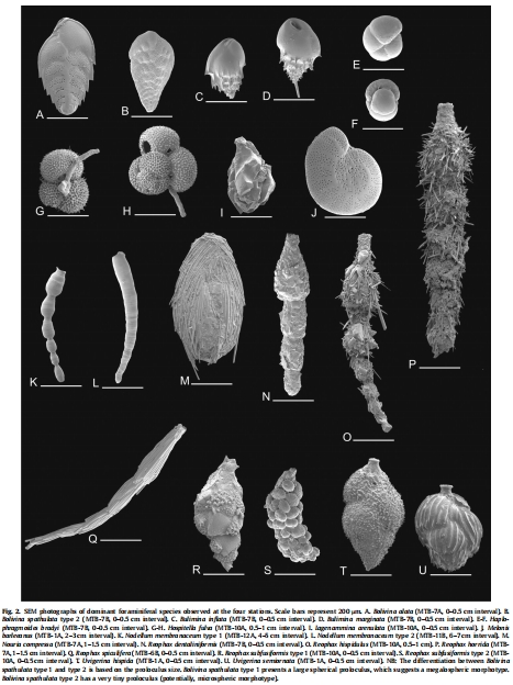 數據:Fig. 2展示主要物種SEM照片(如Bolivina alata、Bulimina marginata);Fig. 7通過堆疊圖顯示物種垂直分布,如上坡站點Bolivina alata在0.5-2.0 cm豐度最高,峽谷站點Hospitella fulva占據深部微生境。