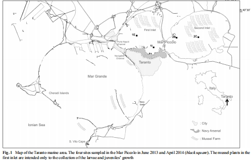采樣設(shè)計:在Mar Piccolo的兩個入口選擇四個站點(Fig. 1),代表不同污染梯度(如St. 1E近航道,St. 1I近兵工廠)。2013年6月和2014年4月進行兩次采樣,使用多管采樣器收集沉積物巖心。