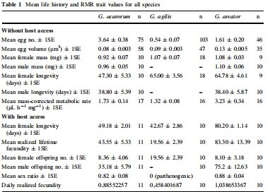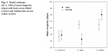 數(shù)據(jù):Table 1 列出壽命(有宿主時(shí)):G. areator 最長(zhǎng)(80.20 ± 1.14 天),G. acarorum 最短(49.18 ± 2.01 天);Fig. 4 顯示壽命受宿主訪問(wèn)影響,如 G. agilis 無(wú)宿主時(shí)壽命延長(zhǎng)。