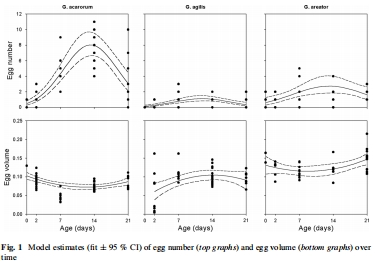 數(shù)據(jù):Table 1 顯示平均卵數(shù):G. acarorum 最高(3.64 ± 0.38),G. agilis 最低(0.54 ± 0.07);Fig. 1 通過(guò)模型估計(jì)展示卵數(shù)和卵體積隨時(shí)間變化,如 G. acarorum 卵數(shù)在 14 天達(dá)峰。