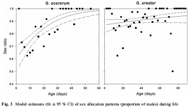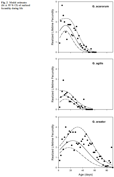 數(shù)據(jù):Table 1 中實(shí)際后代數(shù):G. areator 最高(83.30 ± 13.39),G. agilis 最低(19.56 ± 2.39);Fig. 2 顯示繁殖力隨年齡變化,G. areator 持續(xù)高產(chǎn);Fig. 3 表明有性物種雄性比例高(G. acarorum 雄性占 82%,G. areator 占 88%)。