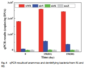 數據:Fig. 4 顯示,第150天時R1的anammox細菌16S rRNA基因拷貝數(2.59±0.009×10? copies ng?1)略高于R0(2.44±0.004×10? copies ng?1);反硝化基因nirS和nirK的拷貝數在R1(5.73×10?和2.70×10? copies ng?1)顯著高于R0(3.78×10?和2.18×10? copies ng?1)。