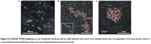 HAADF-STEM(圖3):直接觀察到[Mo?]簇以鏈狀或二維網絡排列,Mo-Mo間距(2.1 ?)與[Mo?S??]2?簇匹配。