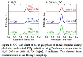 研究意義:圖3顯示13CO為主要產物,證明CO2是唯一碳源(無12CO干擾),排除電解質分解的可能。圖8表明使用30% H2^18O時,16O^18O和18O2比例顯著增加(雖低于理論值),部分確認O2來自水氧化,而非空氣污染或催化劑分解。