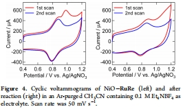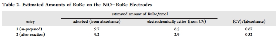數據來源:圖4通過循環伏安法(CV)測量NiO-RuRe電極在乙腈中的氧化峰;表2對比反應前后電化學活性RuRe數量。
