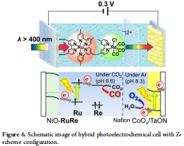 論文報道了一種新型雜化光電化學電池,由基于Ru(II)-Re(I)超分子金屬復合物光催化劑(RuRe)的NiO光陰極(NiO-RuRe)和CoOx/TaON光陽極組成。該系統在可見光照射下,以水為還原劑實現CO2還原生成CO和O2,并借助外部電偏壓(0.3 V)和化學偏壓(pH差產生的0.10 V)驅動。這是首個利用分子光催化劑與半導體光催化劑雜化構建的可見光驅動CO2還原系統,避免了犧牲劑的使用,為人工光合作用提供了新策略。