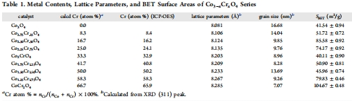 研究意義:PXRD峰位移(圖1)證實Cr3?成功摻入Co?O?晶格,引起晶格膨脹(d-間距增加)。表1顯示晶格參數(shù)從Co?O?的8.081 ?線性增至CoCr?O?的8.285 ?(符合Vegard定律),表明摻雜均勻且無相分離。BET表面積(41–105 m2/g)用于歸一化活性,排除表面積影響,凸顯本征活性變化。
