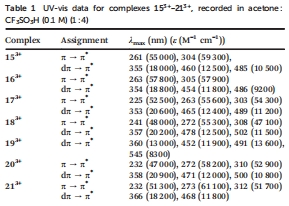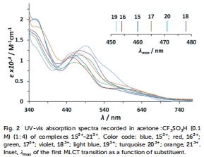 數據來源:圖2顯示配合物153?–213?在CF?SO?H/丙酮中的UV-vis吸收光譜;Table 1總結最大吸收波長(λmax)和摩爾吸光系數(ε)。