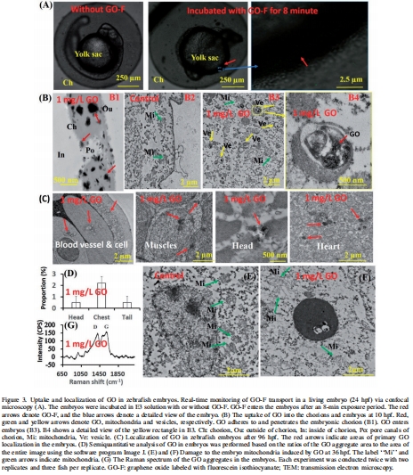 數據來源:Figure 3A的LSCM圖像顯示GO-F在8分鐘內進入胚胎,富集于卵黃囊;Figure 3B-E的TEM顯示GO進入線粒體并破壞膜完整性;Figure 3G拉曼光譜證實胚胎內GO存在。