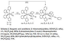 分子設計與合成:合成外消旋和手性純的釕配合物(rac-2、Δ-2和Λ-2),其中L配體上的苯乙炔基單元作為環糊精包結位點(Scheme 2)。