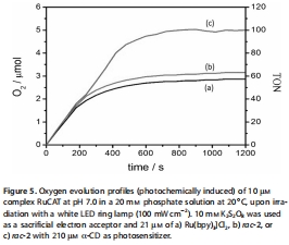 區分包結與催化劑作用:對照實驗([Ru(bpy)?]2?+α-CD)的氧演化曲線與無CD時重疊,證明環糊精僅保護光敏劑而非催化劑(RuCAT)。Unisense測量排除了CD對催化劑的間接影響,突出了包結的特異性,支持了Scheme 1中提出的機制——包結僅屏蔽光敏劑敏感位點,而不阻礙電子轉移。