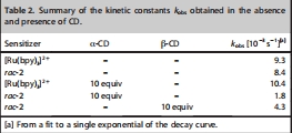 研究意義:添加α-CD后,rac-2的k_obs從8.4×10?3 s?1降至1.8×10?3 s?1,降解減緩約4倍,表明包結部分保護了配合物;β-CD也顯示保護作用(k_obs=4.3×10?3 s?1),但效果較弱,與包結度(α)正相關(Figure 4插圖)。
