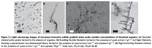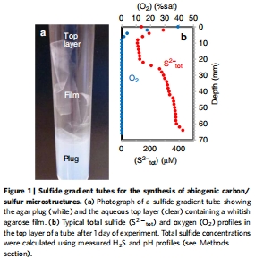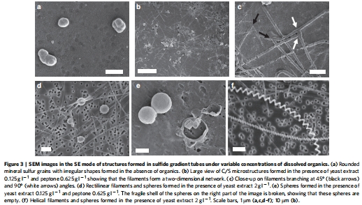 非生物成因C/S微結構的存在:在無菌硫化梯度中,有機質與硫化物反應可自組裝形成管狀/球狀C/S微結構,無需微生物參與。