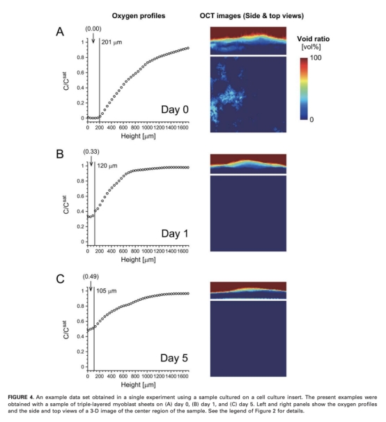 研究思路是使用層疊的成肌細胞片作為三維工程組織模型,通過溫度響應培養皿制備單層、雙層和三層細胞片。研究結合了氧微電極系統(使用丹麥Unisense電極)測量垂直軸上的氧濃度剖面,以及OCT系統獲取組織橫截面圖像以估計厚度。測量在培養的第0天、第1天和第5天進行,參數包括 pericellular oxygen concentrations (POC)、培養基氧梯度 (gradOxy_medium) 和組織氧梯度 (gradOxy_tissue)。同時,通過生化分析測量葡萄糖消耗率和乳酸產生率,并利用圖像處理分析空腔比率。研究還比較了在正常培養皿和多孔膜培養插入物上的培養效果,以評估不同培養條件對組織活性的影響。