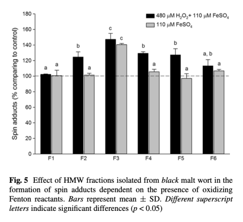 5 高分子量組分對(duì)自由基形成的影響數(shù)據(jù):來(lái)自圖5,顯示了黑麥芽分離的HMW組分(F1-F6)在Fenton反應(yīng)中對(duì)自旋加合物水平的影響。研究意義是組分F3(顏色最深)導(dǎo)致自由基增加約40%,明確證實(shí)高分子量化合物是促氧化劑,通過(guò)還原Fe3+來(lái)促進(jìn)自由基生成,影響啤酒氧化穩(wěn)定性。