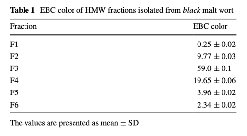 6 EBC顏色數(shù)據(jù):來(lái)自表1,列出了黑麥芽HMW組分的顏色值(如F3為59.0 EBC)。研究意義是顏色強(qiáng)度與促氧化活性相關(guān),表明褐變程度高的組分更具反應(yīng)性,為快速評(píng)估麥芽氧化潛力提供簡(jiǎn)單指標(biāo)。