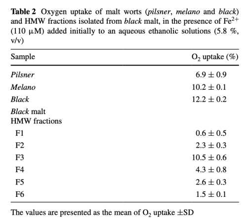 7 氧攝取數(shù)據(jù):來(lái)自表2,測(cè)量了麥芽麥汁和HMW組分在Fe2+存在下的氧消耗百分比(如黑麥芽為12.2%)。研究意義是氧消耗增加表明氧化反應(yīng)加速,黑麥芽和HMW組分(如F3為10.5%)促進(jìn)氧消耗,驗(yàn)證了其在啤酒模型中加速金屬催化氧化的作用。