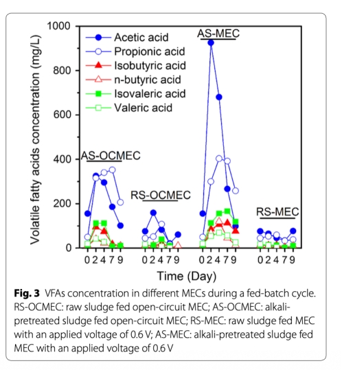 3 揮發性脂肪酸濃度數據:來自圖3,顯示AS-MEC中乙酸濃度在2天內從260 mg/L升至1550 mg/L。研究意義是表明堿預處理和MEC促進污泥酸化和底物水解,為產電菌提供更多基質,增強系統代謝活性。