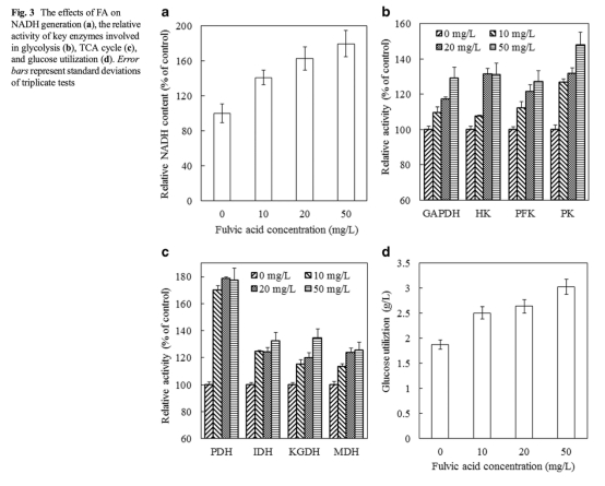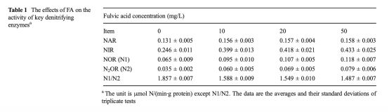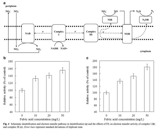 3 電子轉(zhuǎn)移系統(tǒng)活性數(shù)據(jù):來自圖4b、4c,顯示復(fù)合物I和III活性在FA存在下分別提高至對照的155%和181%。研究意義是表明FA作為電子穿梭體增強電子從NADH向反硝化酶的傳遞,加速氮氧化物還原,解釋了FA減少中間產(chǎn)物積累的原因,為改善電子流在環(huán)境工程中的應(yīng)用提供參考。
