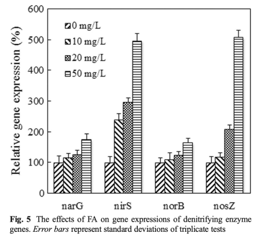 4 反硝化酶基因表達和活性數(shù)據(jù):來自圖5和表1,顯示nirS和nosZ基因表達分別增至對照的497%和508%,NIR和N2OR活性顯著提高。研究意義是證實FA在轉(zhuǎn)錄和酶水平上上調(diào)關(guān)鍵反硝化酶,特別是減少N2O排放,凸顯FA在 mitigating溫室氣體排放方面的潛力,為基因工程和酶調(diào)控研究提供新方向。