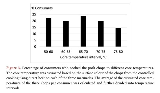 3 消費者烹飪核心溫度數據:來自圖3,通過多光譜成像估計家庭燒烤豬排的核心溫度分布。研究意義是揭示多數消費者烹飪溫度較低(42%低于65°C),減少HCA形成,但高溫烹飪增加HCA風險,提示教育消費者控制溫度的重要性。