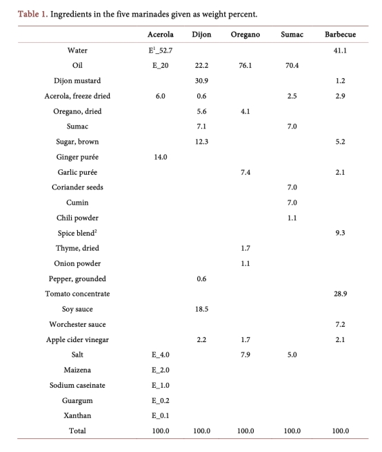 研究目的是評估基于針葉櫻桃、牛至和漆樹的美味復雜腌料對抑制雜環芳香胺形成的影響,并將其與消費者反應聯系起來,以結合美食學和化學研究開發有效腌料。