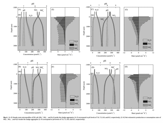 2 測量了污泥聚集體內(nèi)部的微環(huán)境參數(shù),包括溶解氧、pH、銨氮、亞硝酸鹽和N2O的濃度剖面。數(shù)據(jù)來自圖4(A-D),顯示溶解氧在外層消耗殆盡,內(nèi)層呈缺氧狀態(tài);N2O濃度隨深度增加,且低pH下更高。研究意義在于揭示N2O產(chǎn)生的空間異質(zhì)性,幫助識(shí)別亞硝化(外層)和反硝化(內(nèi)層)途徑的貢獻(xiàn),為理解微生物反應(yīng)機(jī)制提供微觀證據(jù)。