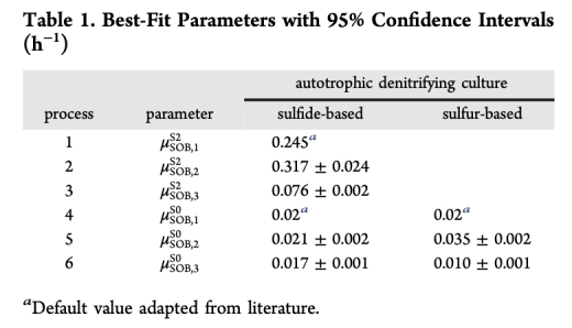 4. 數(shù)據(jù)來自表1:提供了最佳擬合參數(shù)值,如最大反應(yīng)率(μSOB,2、μSOB,3等),用于模型校準(zhǔn)。研究意義是獲得關(guān)鍵動力學(xué)參數(shù),增強(qiáng)模型可靠性,并揭示硫化物基和硫基AD過程的速率差異,反映微生物群落的影響。