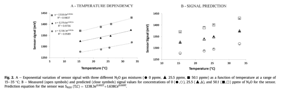 2 數(shù)據(jù)來自圖2和溫度測(cè)試:測(cè)量了傳感器信號(hào)在15-33°C溫度范圍內(nèi)的指數(shù)依賴性,使用雙指數(shù)方程擬合(如S_N2O(T,C)=1238.3e^(0.002T) + 1.638Ce^(0.009T))。研究意義是溫度補(bǔ)償模型僅需6個(gè)校準(zhǔn)點(diǎn)即可準(zhǔn)確預(yù)測(cè)信號(hào),最大誤差3.0%,使傳感器適用于全規(guī)模廠的溫度波動(dòng)環(huán)境,提高數(shù)據(jù)可靠性。