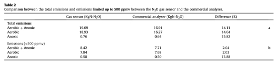 3 數(shù)據(jù)來自圖3和表2:測(cè)量了全規(guī)模SBR在4天監(jiān)測(cè)期內(nèi)氣相N2O排放動(dòng)態(tài),比較氣體傳感器和商業(yè)分析儀的結(jié)果。總排放量氣體傳感器為19.69 kg N-N2O,商業(yè)分析儀為16.91 kg N-N2O,差異14.1%。研究意義是傳感器在高濃度峰值(>500 ppmv)時(shí)更準(zhǔn)確,商業(yè)分析儀飽和導(dǎo)致低估,突出傳感器在捕捉峰值排放方面的優(yōu)勢(shì),對(duì)準(zhǔn)確評(píng)估溫室氣體排放因子至關(guān)重要。