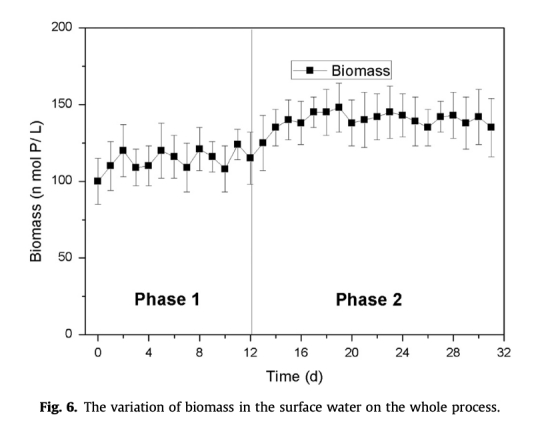 5 測量了地表水中生物量的變化。數據來自圖6,顯示Phase 2中PHA添加后生物量略有增加但整體穩定。研究意義在于驗證微生物附著在膜上而非釋放到水體,避免二次污染。