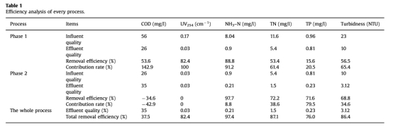 1 測量了化學需氧量(COD)、UV254、氨氮(NH3-N)、總氮(TN)、總磷(TP)和濁度等水質指標的變化。數據來自圖5(b、c、d)和表1。研究意義在于量化污染物去除效率,顯示增強MABR能有效降解有機物和去除氮磷,其中COD和UV254的去除表明大分子有機物和芳香化合物的降解,氮磷濃度降低證明生物同化作用。