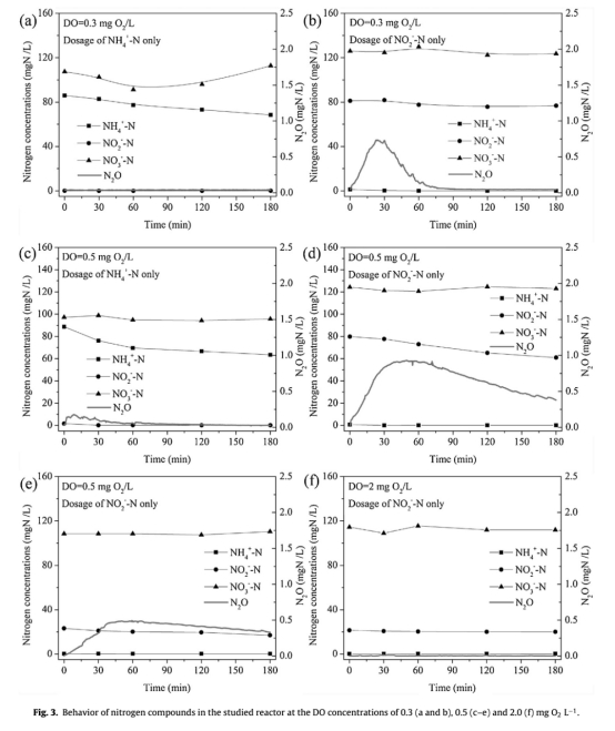 2. 數據來自圖3:測量了僅添加銨或亞硝酸鹽時不同DO濃度(0.3、0.5和2.0 mg O? L?1)下氮化合物的行為,包括N2O積累。研究意義是揭示DO如何影響氮轉化途徑,例如在低DO下N2O生產表明自養反硝化存在,而高DO抑制該過程,強調DO在調節微生物群落中的作用。